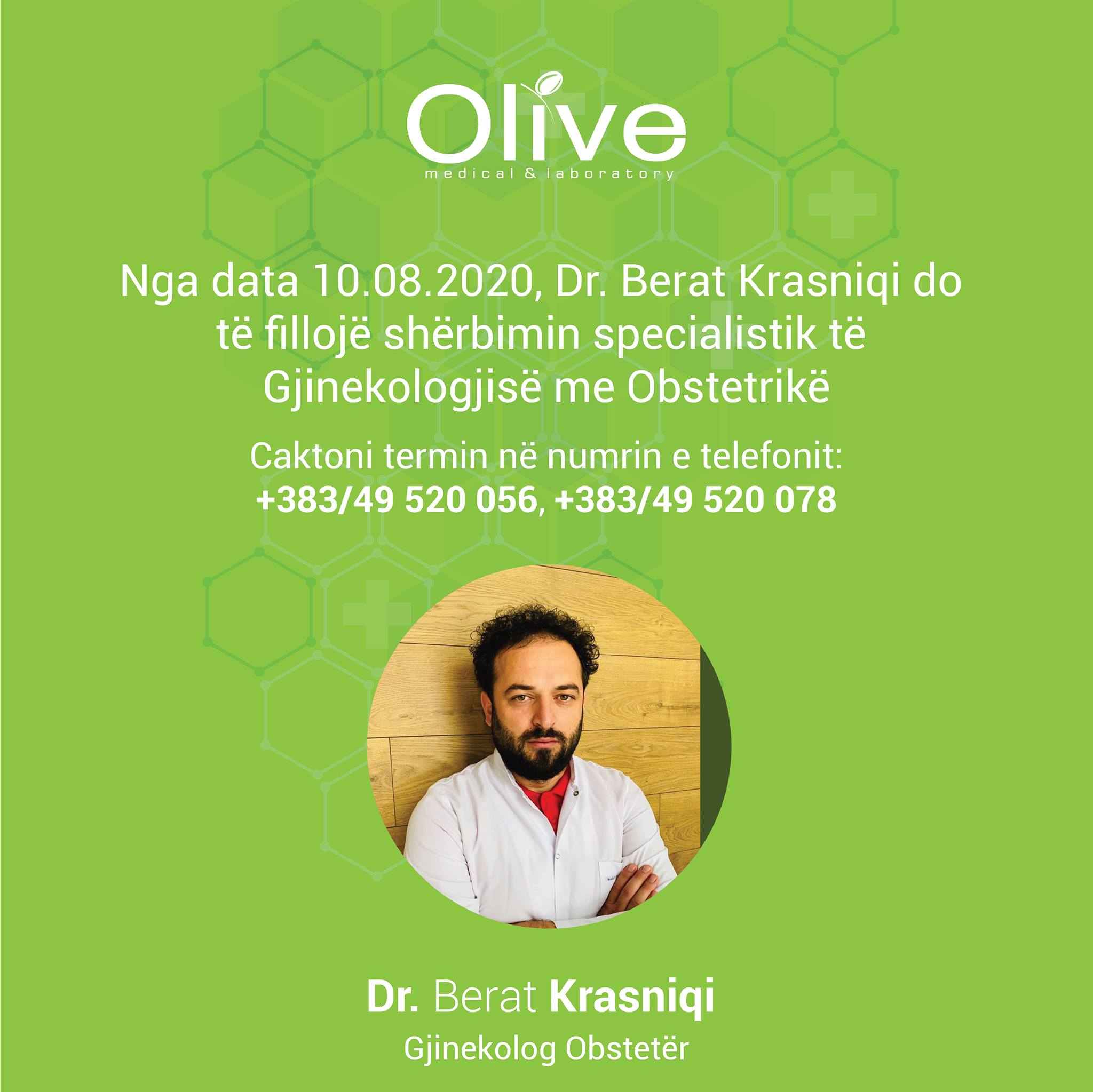 Nga data 10.08. Dr. Berat Krasniqi ka filluar shërbimin e Gjinekologjisë me Obstetrikë në Olive Medical & Laboratory!